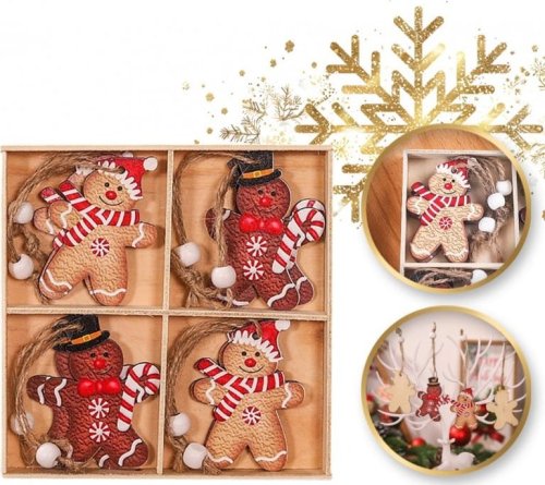 Komplet zawieszek choinkowych PIERNICZKI 12 sztukDodaj swojemu wnętrzu odrobinę zimowej magii.Pierniczki nadają się jako ozdoba świąteczna do powieszenia na oknie, choince lub jako prezent.Cudowny i praktyczny dodatek do twojego wnętrza. Tymi zawieszkami udekorujesz świąteczne drzewo jak i stroiki czy okna. Specyfikacja:Zestaw 12 sztukZapakowane w drewniane pudełko Materiał: DrewnoWymiary 1 zawieszki:6,5 x 5 cmWymiary pudełka:14 x 14 cmWaga zestawu:67g brutto Poczuj klimat świąt!