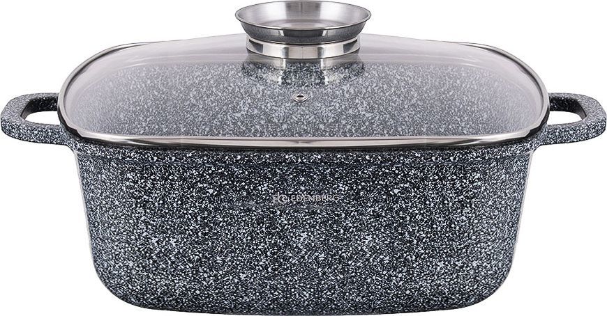 Wysokiej jakości Brytfanna / garnek kwadratowy 28cm / 6.5L ze szklaną pokrywą EDENBERG / EDEL HOFF. Wykonany z odlewu aluminiowego pokrytego marmurową ceramiczną powłoką nieprzywierającą. Produkt z wytrzymałą, nieprzywieralną powłoką marmurową pozwala na zdrowe, beztłuszczowe gotowanie i łatwe mycie, a przede wszystkim chroni jedzenie przed przypaleniem. Zastosowany materiał perfekcyjnie utrzymuje i przewodzi ciepło. Wyposażona w uchwyt z dozownikiem na przyprawy. Przejrzysta szklana pokrywa z uchwytem typu Aroma Knob jest odporna na stłuczenia i pozwala obserwować proces gotowania bez zdejmowania pokrywki. Posiada specjalne dno ferromagnetyczne przystosowane do każdego rodzaju kuchenek: gazowych, elektrycznych, ceramicznych, indukcyjnych i halogenowych. wyjątkowa konstrukcja dna zapewnia doskonałe przewodzenie ciepła oraz uzyskanie równomiernej temperatury na całej powierzchni. Cechy: Marmurowa ceramiczna powłoka nieprzywierającaktóra nie wchodzi w reakcje z żywnością gwarantuje najwyższą jakość posiłków. Powłoka wykonana w nanotechnologii tworzy gęstą, zwartą i gładką warstwę na powierzchni. Brytfanna idealnie nadaje się do pieczenia , smażenia i gotowania. Do kuchenek gazowych, elektrycznych, ceramicznych i indukcyjnych. Równomiernie rozprowadza ciepło, długo je utrzymuje. Pozwala na gotowanie z niewielką ilością oleju. Szklana pokrywa ze specjalnym wlewem na przyprawy tak zwany AROMA KNOB. Umożliwia gotowanie i pieczenie potraw z małą ilością tłuszczu lub wody. Odporny na ścieranie i wysokie temperatury. Można myć w zmywarkach. Wymiary: 28 cm x 28 cm x 12 cm Wysokość bez pokrywy 11 cm. Średnica pola grzewczego 19 cm. Pojemność ~6,5L.
