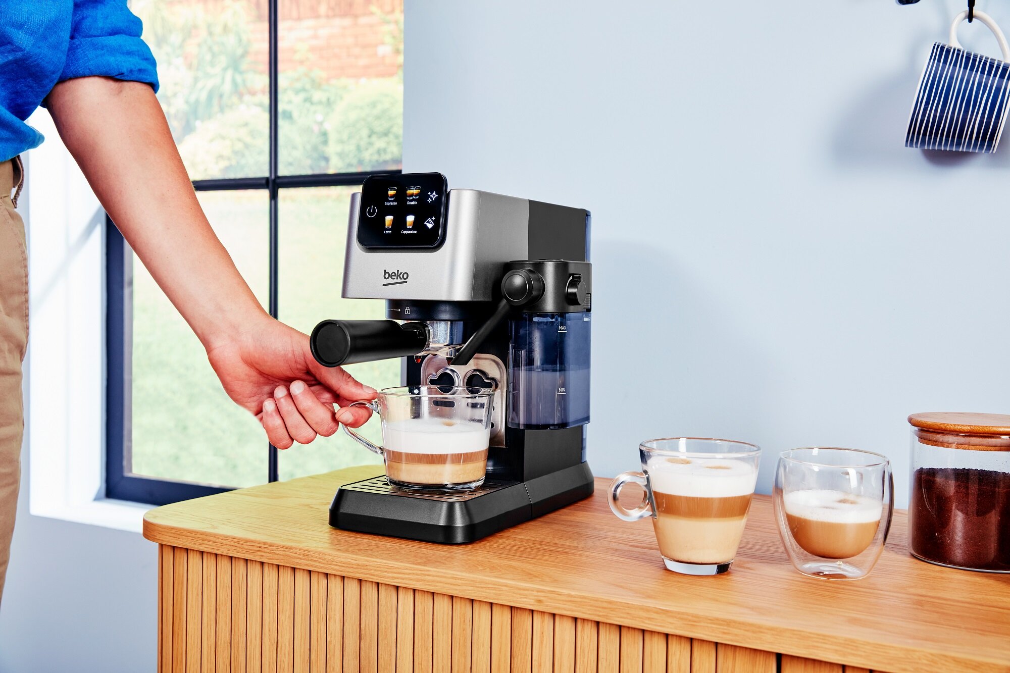 Ekspres został wyposażony w dedykowany pojemnik na mleko o pojemności 300 ml, który pozwala na przygotowanie aksamitnego Cafe Latte czy kremowego cappuccino. System ten umożliwia regulację gęstości pianki, co pozwala dostosować napój do indywidualnych preferencji każdego domownika. Zintegrowana konstrukcja sprawia, że proces spieniania odbywa się automatycznie, bez potrzeby używania zewnętrznych akcesoriów. Ciesz się idealnie białą, puszystą pianką za każdym dotknięciem przycisku.