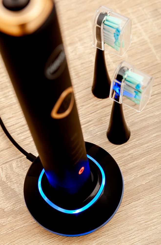 Szczoteczka intensywnie wspomaga wybielanie zębów, chroniąc jednocześnie dziąsła i zapobiegając ich podrażnieniom. W zestawie znajdują się 2 końcówki wymienne oraz stacja indukcyjna z przewodem USB.