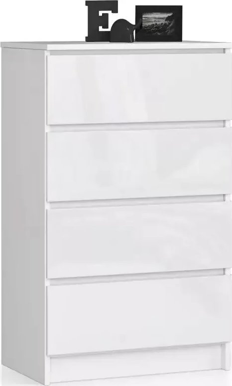 Komoda Branni 4X wyróżnia się elegancką kolorystyką. Białe fronty w połysku kontrastują z matowym korpusem, co nadaje jej nowoczesny i stylowy wygląd, idealny do każdego wnętrza.