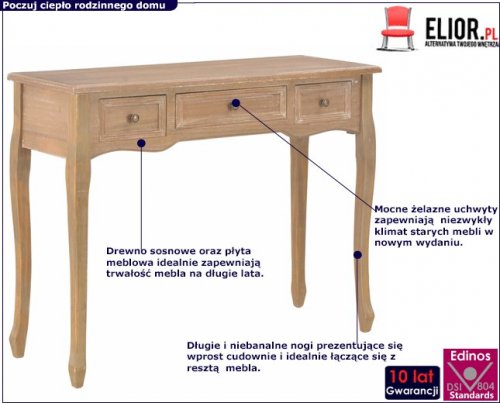 Konsola Fattuto od marki Elior to elegancki brązowy stolik, który przywołuje atmosferę minionych epok. Jego design harmonijnie łączy historyczne style z nowoczesną funkcjonalnością, co czyni go doskonałym dodatkiem do każdego wnętrza.
