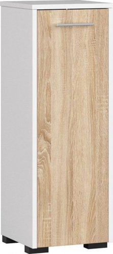 Mebel wykonany jest z wysokogatunkowej płyty laminowanej, co zapewnia mu trwałość oraz estetyczny wygląd. Płyta została uszlachetniona cienkimi filmami melaminowymi oraz oklejona obrzeżem ABS, co zwiększa odporność na zarysowania. Stonowana kolorystyka w bieli i dębie sonoma sprawia, że regał doskonale wpisuje się w różne style aranżacyjne, w tym skandynawski i nowoczesny.