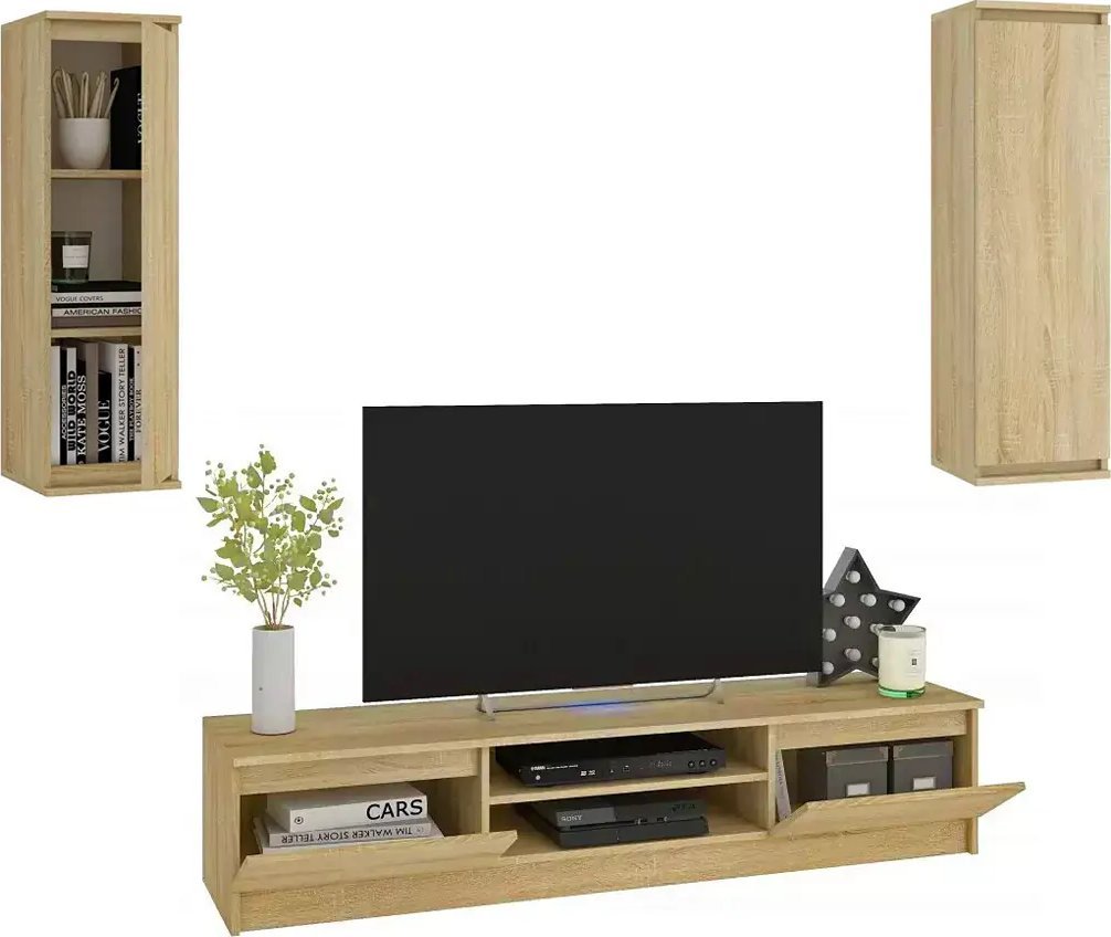 Szafka RTV ma wymiary 160 cm szerokości, 40 cm głębokości oraz 33 cm wysokości, co zapewnia wystarczającą przestrzeń na sprzęt elektroniczny. Dodatkowo, wiszące szafki o wymiarach 30 cm szerokości, 30 cm głębokości i 99 cm wysokości oferują miejsce na książki i drobiazgi, czyniąc meblościankę praktycznym rozwiązaniem do przechowywania.