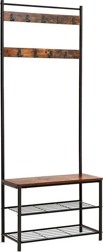 Wieszak został wyposażony w wygodne siedzisko w odcieniu rustykalnego brązu, co umożliwia komfortowe zakładanie i zdejmowanie obuwia. To doskonałe rozwiązanie dla tych, którzy cenią sobie wygodę i funkcjonalność na co dzień.