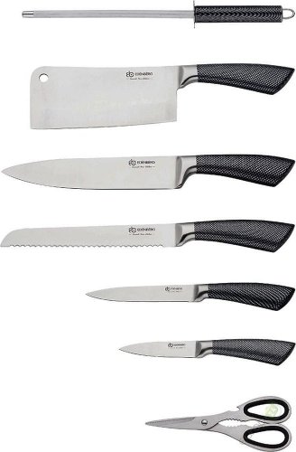 Cechy: Noże świetnie nadają się do codziennego krojenia i siekania owoców, warzyw oraz mięsa, Ergonomiczny kształt rękojeści umożliwia bezpieczne użytkowanie, Ostre ostrze zapewnia długą żywotność bez konieczności ostrzenia przez długie miesiące, Dzięki zastosowanym materiałom żywność nie ma metalicznego smaku czy zapachu a owoce i warzywa nie brązowieją, Krojona żywność nie przykleja się do noży, co ułatwia krojenie, Zestaw zawiera: Nóż szefa kuchni całkowita dł. 33 cm, ostrza 20 cm, Nóż do krojenia chleba całkowita dł. 33 cm, ostrza 20 cm, Nóż tasak całkowita dł. 31 cm, ostrza 17 cm, Nóż uniwersalny całkowita dł. 23 cm, ostrza 12 cm, Nóż do warzyw całkowita dł. 20 cm, ostrza 9 cm, Ostrzałka całkowita dł. 30 cm, ostrza 19 cm, Nożyczki, Stojak uniwersalny.