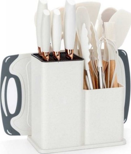 Zestaw 19-elementowy noży kuchennych oraz przyborów wraz z deską do krojenia w stojaku to kompletny i elegancki zestaw do każdej kuchni, który ułatwia codzienne przygotowywanie posiłków. Zestaw zawiera różnorodne noże do różnych zadań kuchennych – od krojenia chleba, przez porcjowanie mięsa, po siekanie warzyw, a także deskę do krojenia, zestaw łyżek i szpatuł, pędzelek silikonowy, ubijaczkę, szczypce, nożyce, które zwiększają jego funkcjonalność. Zestaw przyborów kuchennych wykonanych z drewna kauczukowego i nylonu termoplastycznego. Przybory dedykowane do naczyń z powłokami teflonowymi i ceramicznymi wrażliwymi na zarysowania. Część nylonowa odporna na temperaturę do 200°C noże wyprodukowane w wysokiej temperaturze, w zaawansowanym technologicznie procesie syntezy – ostrza cechuje długa żywotność bez konieczności ostrzenia wyposażone w ergonomiczne, antypoślizgowe uchwyty – wygodne i pewne trzymanie materiał: stal nierdzewna z powłoką nieprzywierającą – nie pozostawiają na żywności nieprzyjemnego, metalicznego posmaku bardzo ostra nietępiąca się powierzchnia brak plam po produktach spożywczych powierzchnia antybakteryjna nie rdzewieją nie pozostawiają smaku metalu na krojonej żywności zalecane używanie noży na drewnianych i plastikowych deskach do krojenia W zestawie: nóż szefa kuchni: 33 cm nóż do filetowania: 33 cm nóż do pieczywa: 33 cm nóż uniwersalny: 23 cm nóż do obierania: 20 cm ubijaczka: 30 cm nożyce: 20 cm szczypce: 23 cm pedzelek silikonowy: 27 cm deska z tworzywa sztucznego: 20 x 32 cm łyżka wazowa: 3 cm łyżka do spaghetti: 31 cm łyżka szpatuła: 31 cm łopatka perforowana: 31 cm szpatuła do mieszania: 31 cm łyżka szumówka: 31 cm łyżka do sosów: 31 cm szpatuła do woka: 31 cm stojak na przybory oraz noże: 21 x 12 x 21 cm Kolor dominujący: biały Noży kuchennych oraz przyborów z drewnianymi rączkami nie zaleca się myć w zmywarkach, tylko mycie ręczne Podane długości noży razem z rękojeściami. Całość pakowane w kolorowe pudełko. ...