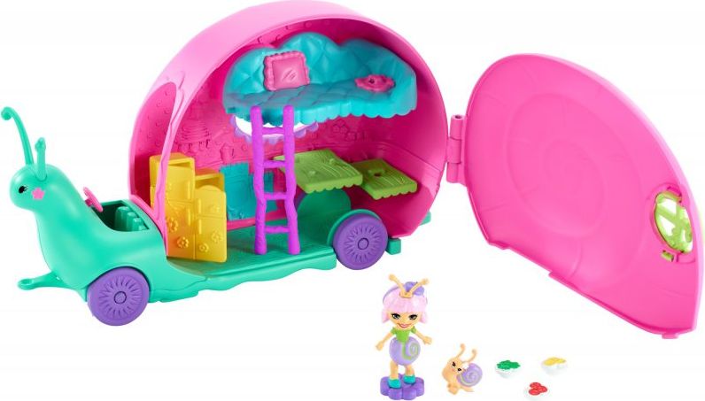 Zestaw z lalką i akcesoriami do zabawy pozwoli dziewczynkom tworzyć fantastyczne historie. W zestawie: Laleczka Enchantimals Małe zwierzątko - ślimak kamper z mebelkami akcesoria |