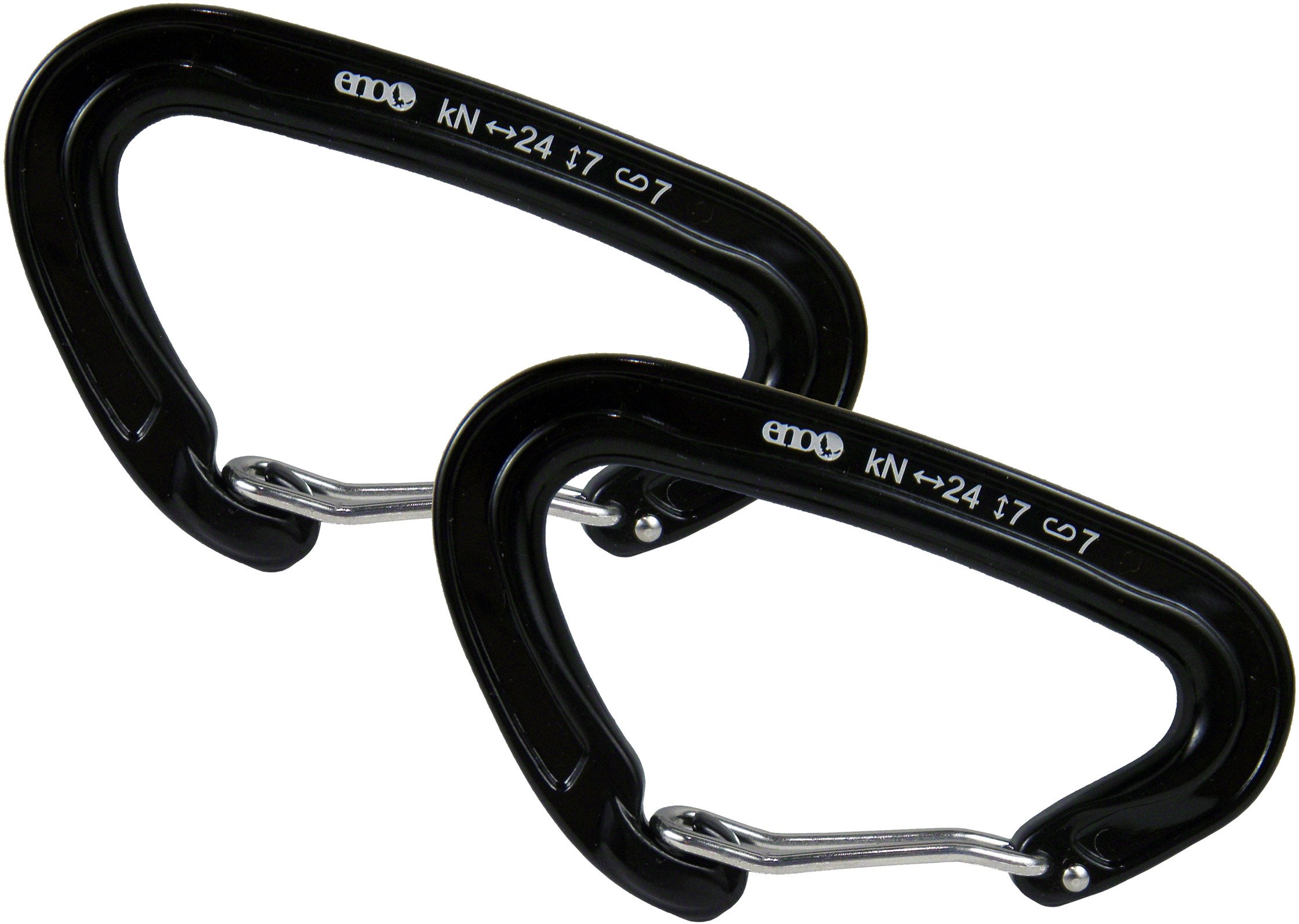 Karabińczyki ENO są wykonane z anodyzowanego aluminium 7075, co gwarantuje ich wyjątkową lekkość (około 18,14 g każdy) oraz wysoką wytrzymałość. Ich konstrukcja oparta na zamku typu Wiregate (druciany zatrzask) umożliwia łatwe i szybkie otwieranie oraz zamykanie, co jest niezwykle przydatne podczas szybkiego montażu i demontażu hamaka. Projekt karabińczyków został przemyślany tak, aby nie posiadały żadnych ostrych krawędzi, które mogłyby uszkodzić delikatny materiał hamaka lub pasy mocujące. Każdy karabińczyk ma udźwig do 181 kg (400 lbs), co czyni je niezawodnym elementem do podwieszania hamaków.