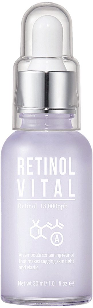 Esfolio - Retinol Vital Ampoule - serum do twarzy z retinolem. Składnik ten doskonale zwalcza oznaki starzenia, ujędrnia skórę, rozjaśnia przebarwienia i wycisza niedoskonałości. Dodatek niacynamidu działa antyoksydacyjnie, reguluje wydzielanie sebum i wspomaga wyrównanie kolorytu cery. Ceramidy wraz z aminokwasami dbają o dostarczenie nawilżenia. Przeciwzmarszczkowe działanie wspomaga obecność adenozyny, która opóźnia procesy starzenia i uelastycznia skórę, dodatkowo przyspieszając jej regenerację.