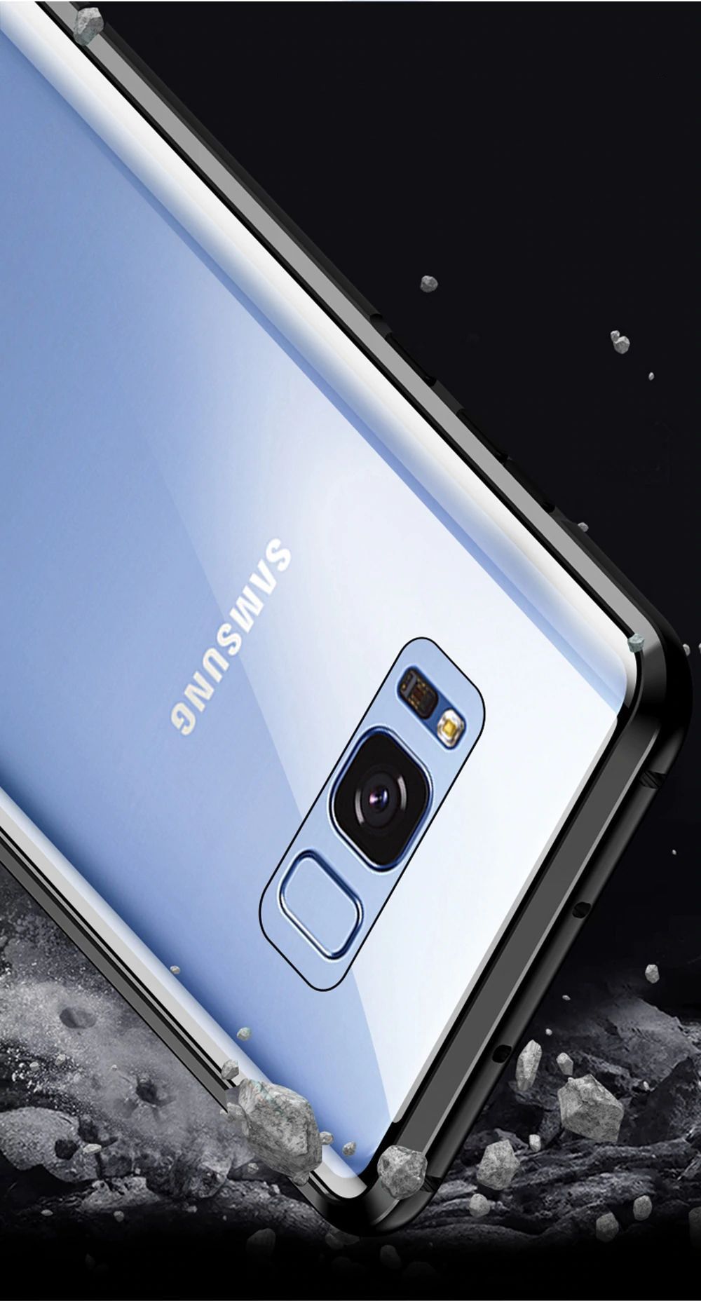 Tył urządzenia chroniony jest przez wytrzymałe przezroczyste szkło, jego ranty zaś chroni wytrzymały aluminiowy bumber, w którego wnętrzu jednocześnie umieszczone zostały magnesy.