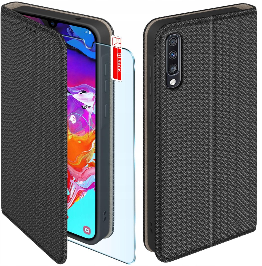 Etui z klapką do Samsung A70 Zamykane Czarne Futerał + Szkło 9H