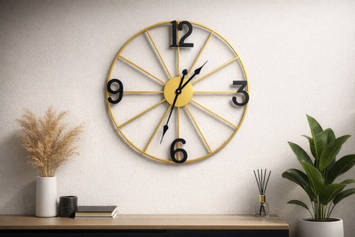 Lekka, otwarta konstrukcja nadaje zegarowi nowoczesnego charakteru i sprawia, że mimo dużego rozmiaru prezentuje się subtelnie na ścianie. Złota rama pięknie rozświetla wnętrze, a czarne cyfry i wskazówki nadają całości wyrazistości i eleganckiego wykończenia. Dzięki temu zegar jest nie tylko praktycznym elementem wyposażenia, ale również dekoracją, która buduje klimat pomieszczenia.
