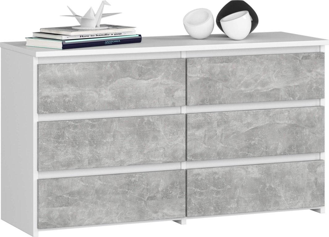 Komoda do salonu CL 100 cm 6 szuflad klasyczna - biała beton to idealne rozwiązanie dla osób poszukujących funkcjonalnego i stylowego mebla do swojego salonu. Wykonana z odpornej na ścieranie płyty laminowanej, gwarantuje trwałość i wytrzymałość przez wiele lat. Posiada sześć pojemnych szuflad, które pomieszczą przeróżne przedmioty - od dokumentów i książek po drobne bibeloty. Niektórzy z naszych klientów wykorzystują tę komodę również do przechowywania ubrań i bielizny.