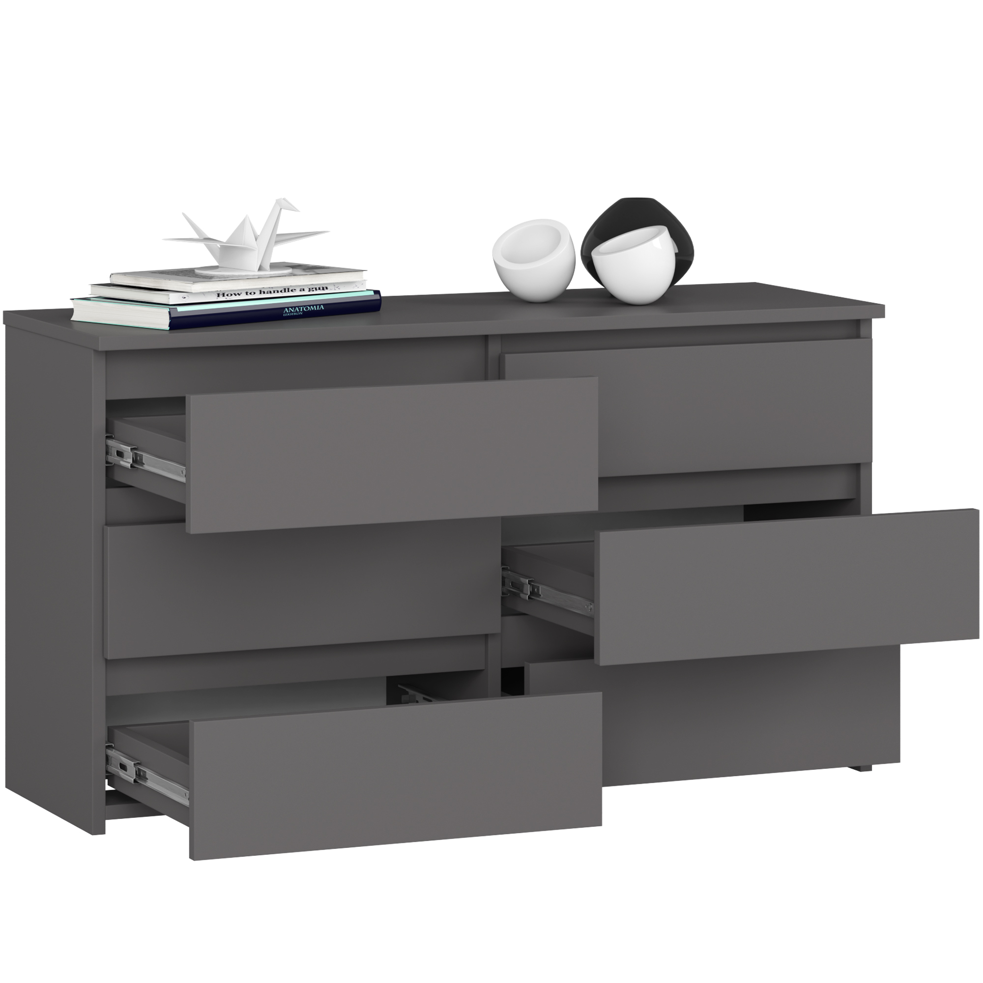 Komoda do salonu CL 100 cm jest praktycznym meblem, który doskonale sprawdzi się w Twoim wnętrzu. Wykonana z wysokiej jakości płyty laminowanej, zapewnia trwałość i wytrzymałość na długie lata. Jej elegancki design w kolorze grafit szary pasuje zarówno do klasycznych, eleganckich jak i romantycznych aranżacji wnętrz. Wysoka funkcjonalność komody zaskoczy Cię ilością miejsca do przechowywania. W sześciu pojemnych szufladach pomieścisz przeróżne przedmioty, takie jak książki, dokumenty czy bibeloty.
