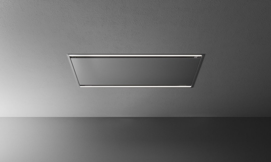 Falmec Mirage wyróżnia się subtelnym montażem na suficie, co sprawia, że przypomina nowoczesny panel świetlny. Jego minimalistyczny wygląd sprawia, że staje się nie tylko praktycznym urządzeniem, ale również stylowym elementem dekoracyjnym w kuchni.