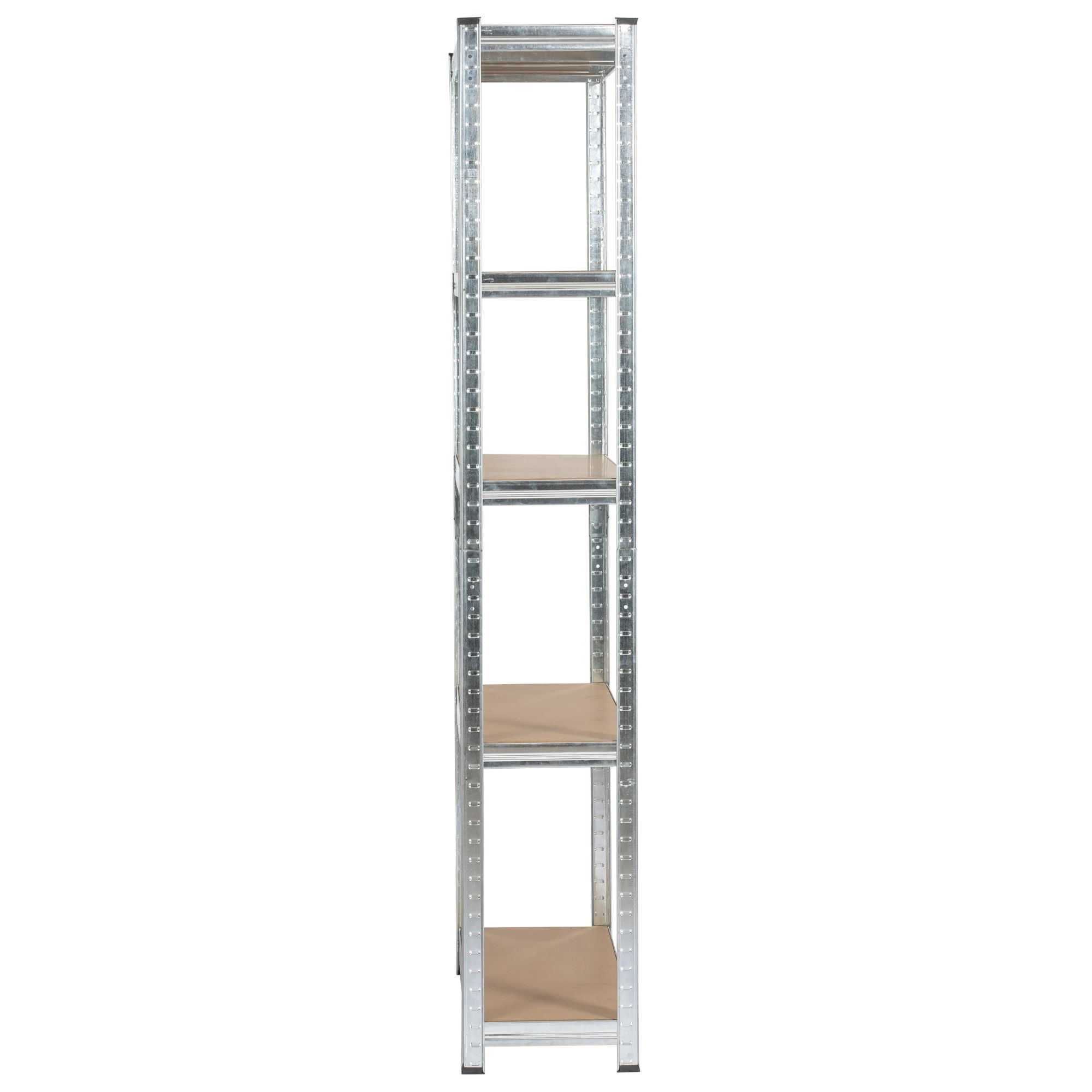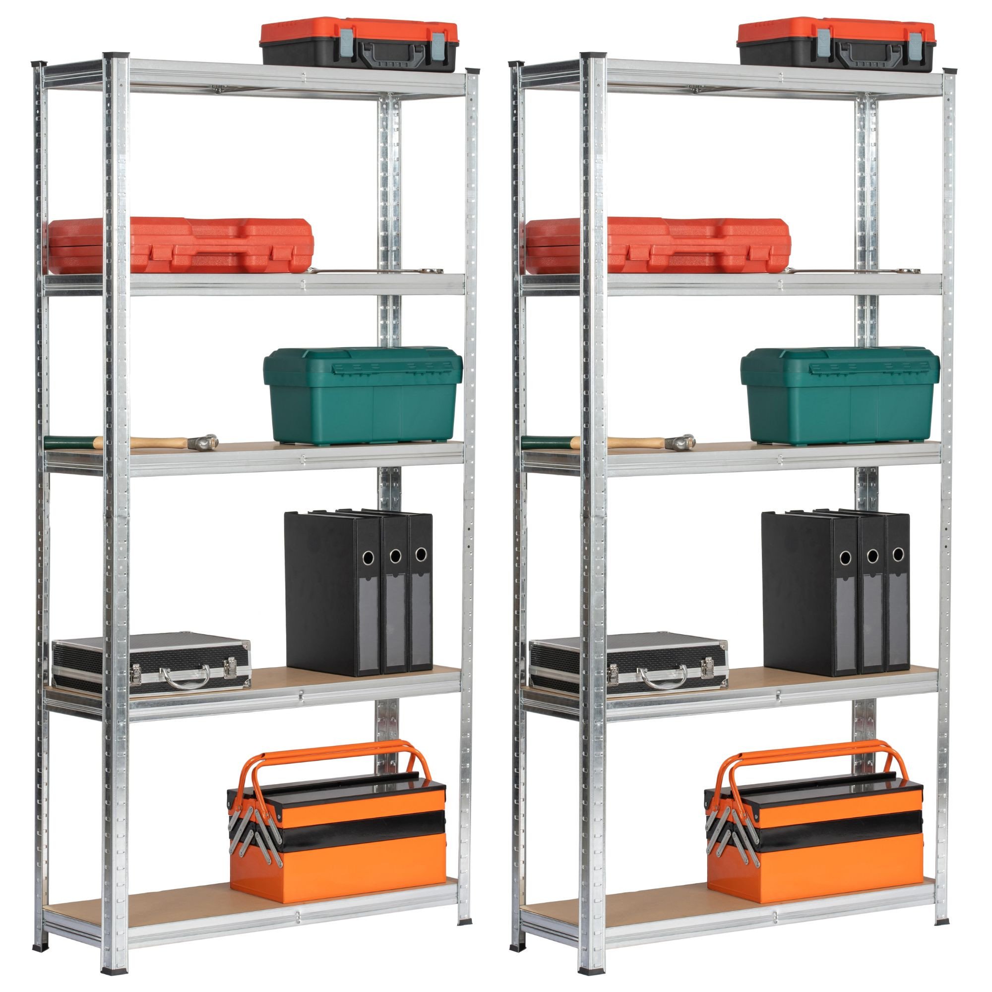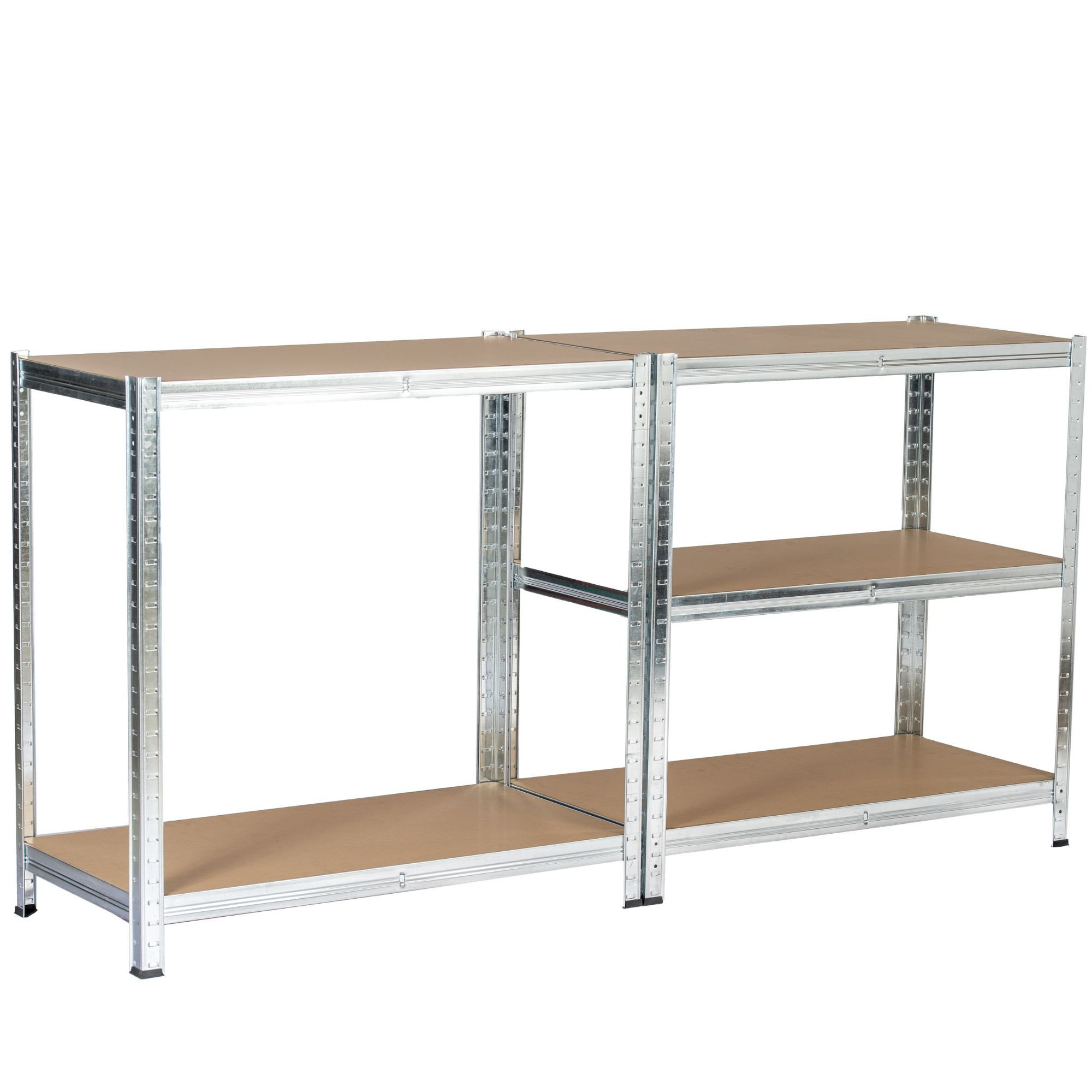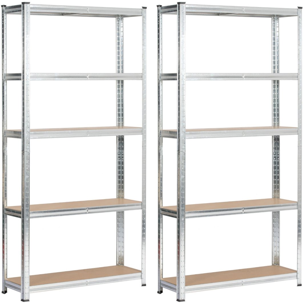 Zestaw dwóch metalowych regałów magazynowych o wymiarach 90x30x180 cm w kolorze srebrnym, idealny do przechowywania w garażu, warsztacie, piwnicy czy pomieszczeniach gospodarczych. Regały posiadają stalową konstrukcję, która zapewnia wyjątkową trwałość i odporność na uszkodzenia. Dzięki wytrzymałym półkom z płyty MDF, każda z nich może udźwignąć do 175 kg, co pozwala na bezpieczne przechowywanie ciężkich narzędzi, sprzętu oraz innych akcesoriów.