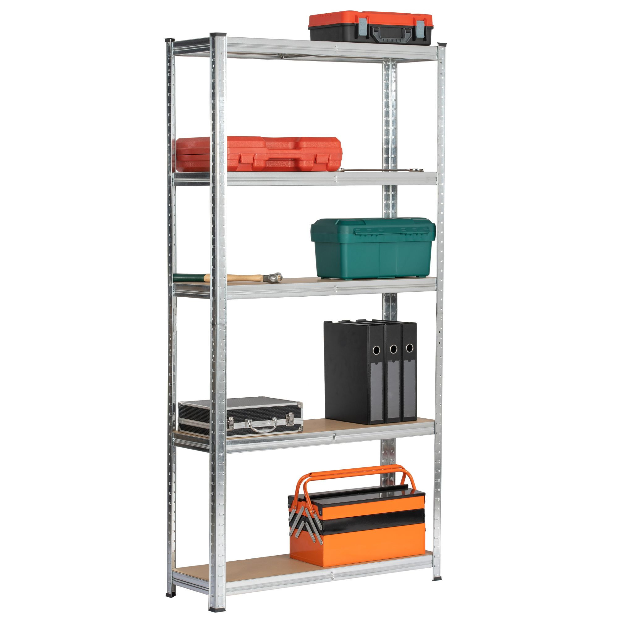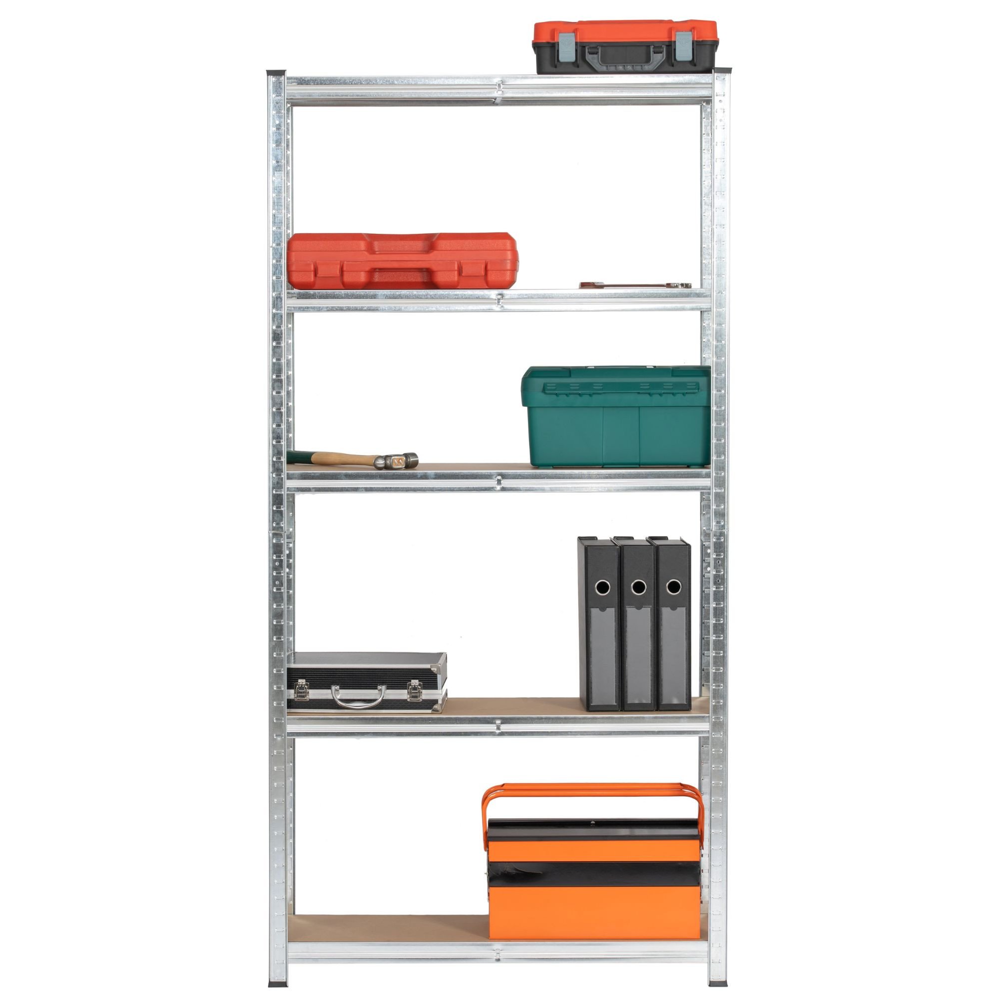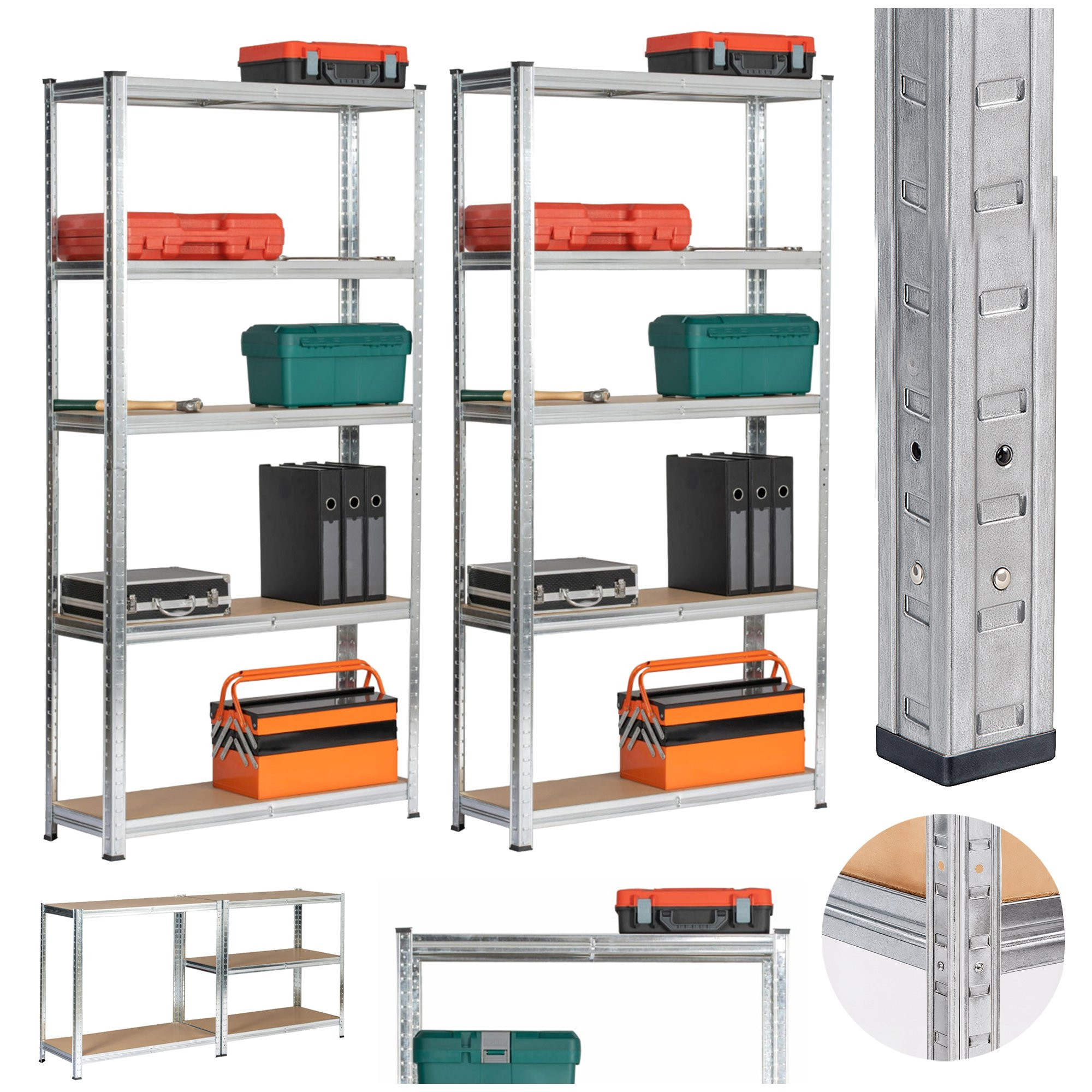 Zestaw dwóch metalowych regałów magazynowych o wymiarach 90x30x180 cm w kolorze srebrnym, idealny do przechowywania w garażu, warsztacie, piwnicy czy pomieszczeniach gospodarczych. Regały posiadają stalową konstrukcję, która zapewnia wyjątkową trwałość i odporność na uszkodzenia. Dzięki wytrzymałym półkom z płyty MDF, każda z nich może udźwignąć do 175 kg, co pozwala na bezpieczne przechowywanie ciężkich narzędzi, sprzętu oraz innych akcesoriów.