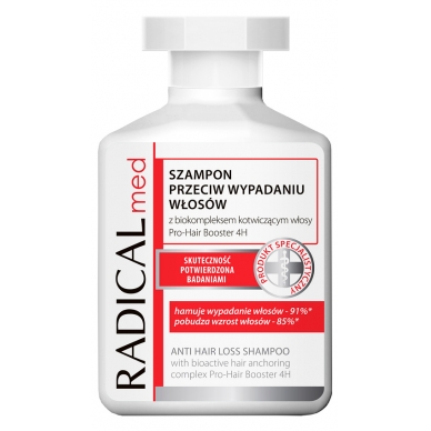 Farmona Radical Med przeznaczony jest do mycia włosów osłabionych i wypadających. Dzięki zawartości ekstraktu ze skrzypu polnego oraz biokompleksu kotwiczącego włosy Pro-Hair Booster 4H, szampon wyraźnie wzmacnia i hamuje wypadanie włosów. Zawarte w szamponie witaminy odżywiają i poprawiają kondycję włosów, sprawiając, że stają się aksamitne i gładkie w dotyku.