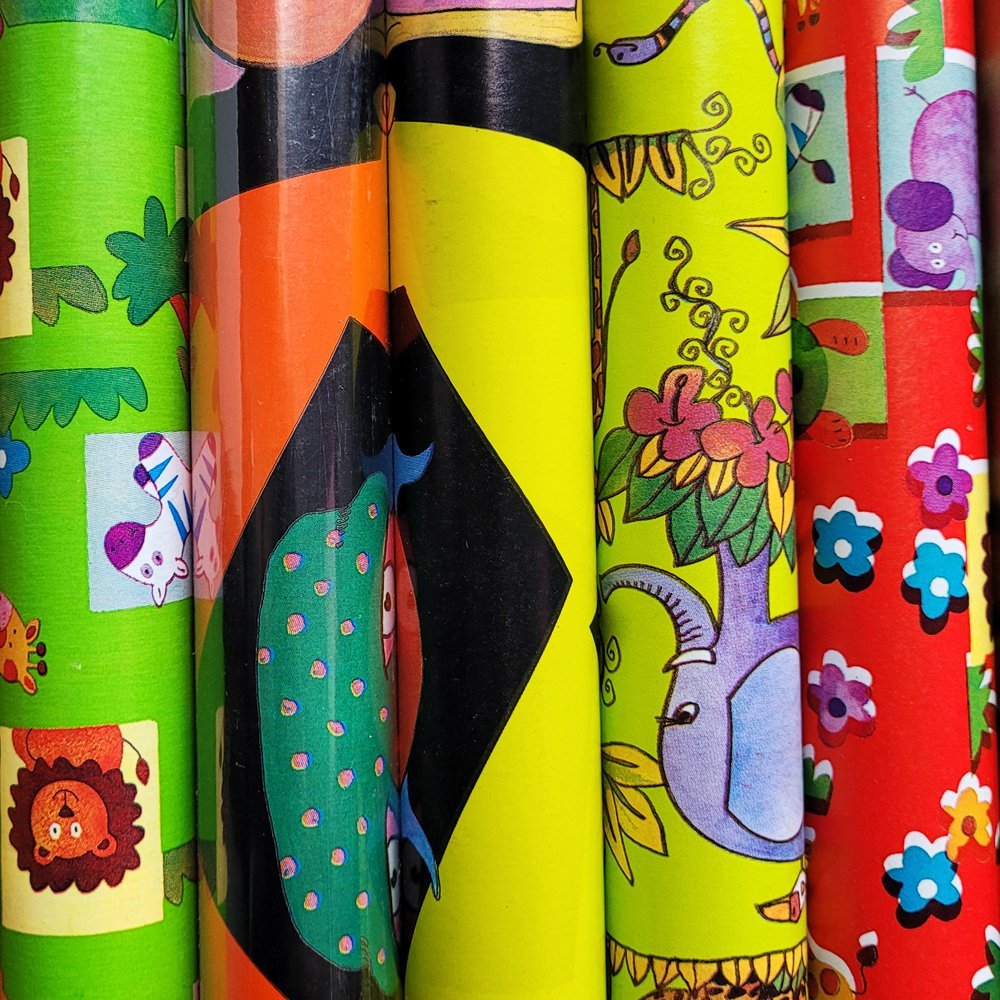 Przedmiotem aukcji jest zestaw 5 rolek papieru ozdobnego w różnych wzorach i kolorach. W skład zestawu wchodzi 5 rolek o szerokości 57 cm i długości 2 metrów.