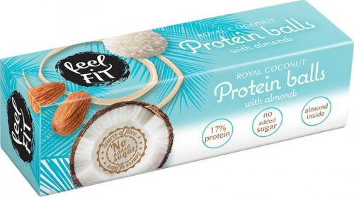 Kulki proteinowe marki FEEl Fit z wafelka, z kremem białkowym o smaku kokosowym i z migdałem, obsypane wiórkami kokosowymi. Pozwól sobie na przyjemność bez wyrzutów sumienia. Sięgnij po pyszny i chrupiący wafelek otoczony wiórkami kokosowymi z BIAŁKOWYM KREMEM o delikatnej konsystencji i kokosowym smaku. Odkryj migdał w środku. Rozkoszuj się smakiem. Wiesz, że możesz… bo kulki nie zawierają dodanego cukru, są źródłem białka i błonnika. Dodatkowa porcja białka w słodyczy syci na dłużej dzięki czemu łatwiej zaspokoić apetyt na słodkie.