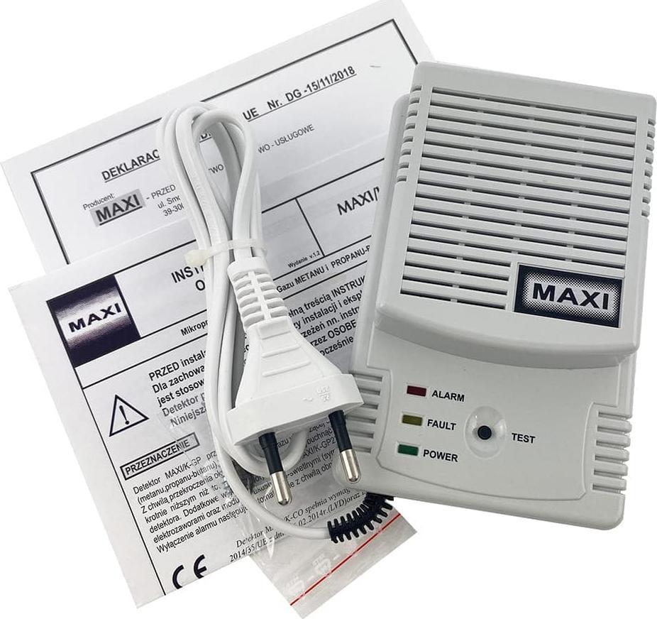 Czujnik typu MAXI/K-GP przeznaczony jest do monitorowania zamkniętych pomieszczeń pod kątem obecności gazów palnych: metanu i propanu-butanu. Detektor dokonuje ciągłego pomiaru stężenia gazu w otaczającym powietrzu. Z chwilą przekroczenia wartości gazu wynoszącej około 15% Dolnej Granicy Wybuchowości DGW (czyli przy stężeniu gazu około 7-krotnie niższym niż to, przy którym gaz może wybuchnąć) zostaje włączona optyczna i akustyczna sygnalizacja alarmowa. Wyłączenie alarmu następuje automatycznie z chwilą osiągnięcia stężenia gazu poniżej
