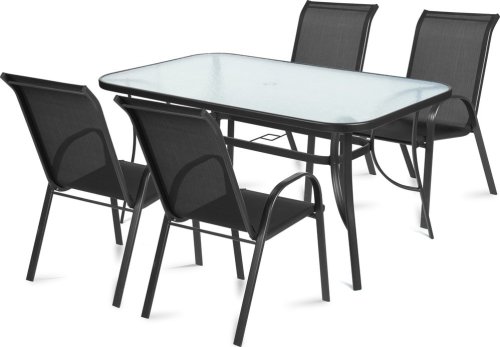 Stół w zestawie ma wymiary 150 x 90 x 71 cm, co sprawia, że jest idealnym rozwiązaniem zarówno do niewielkich, jak i większych przestrzeni. Wykonany z hartowanego szkła, stół nie tylko wygląda elegancko, ale także zapewnia trwałość i odporność na uszkodzenia.