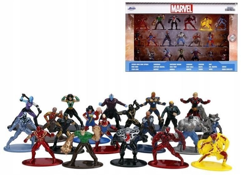 Zestaw składa się z 20 metalowych figurek na podstawkach, dzięki którym figurki bez problemu samodzielnie stoją. Figurki przedstawiają znane z komiksów Marvela postacie, i pomimo, że są niewielkich rozmiarów, bo mają około 3,5 - 4 cm centymetrów wysokości, to bardzo dobrze odzwierciadlają swoje komiksowe pierwowzory. W zestawie znajdziemy m.in.: Spidermana czy Czarną Panterę.