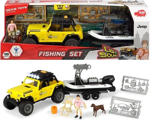 W zestawie samochód Jeep, laweta, łódź rybacka, figurka wędkarza, figurka psa oraz akcesoria.
