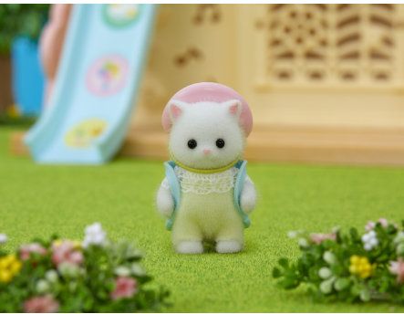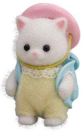 Czyż Ryan, uroczy mały perski kotek, nie jest rozkoszny? Mały biały perski kotek Sylvanian Families nosi żółte ubranko, czerwono/pomarańczowy kapelusz i niebieski plecak. Nóżki i rączki figurek są ruchome. Figurka ma wielkość ok. 4 cm.