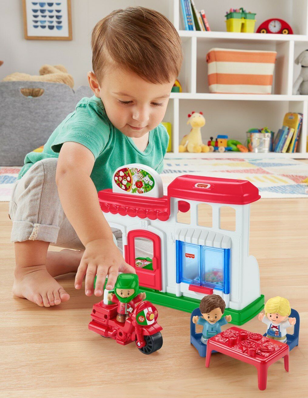 Dzięki Little People Pizzeria od Fisher-Price dzieci mogą serwować pizzę ze szczyptą zabawy. Mali kucharze mogą pomóc szefowi kuchni upiec pizzę, a następnie podać ją figurce Eddiego, odwracając blat, aby odsłonić jego zamówienie. Dzieci mogą nawet przygotować pizzę na wynos i posadzić dostawcę na motocyklu do popychania, aby dostarczyć ją, gdzie tylko chcą.