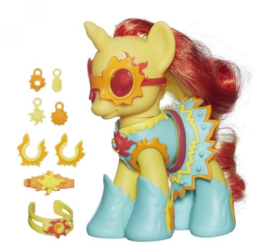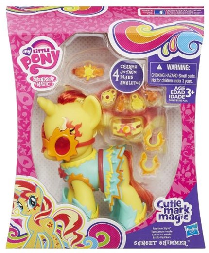 Kucyki MLP to idealne figurki do kolekcjonowania i poznania całego świata My Little Pony. To doskonałe rozwiązanie dla dziewczynek, które znają kucyki z serialu TV i chciałyby mieć takie same w domu, by podczas zabawy przenosić się do świata fantazji. Sunset Shimmer jest to żółty kucyk z czerwono – żółtą grzywą. Kucyk ubrany jest w błękitną sukienkę oraz buciki z pomarańczowo - żółtymi wzorkami, a także czerwonym paskiem. Na głowie konika znajdują się pomarańczowo - czerwone okulary. W zestawie znajdują się zawieszki, kolczyki, spinka, a także naszyjnik do przyozdobienia Sunset.