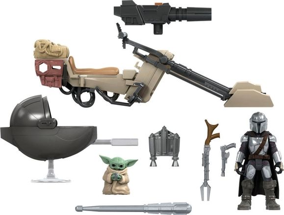Zestaw z serii Star Wars™ Mission Fleet zawiera pojazd mandaloriańskiego wojownika z zamontowanym działem do poskramiania nieprzyjaciół. Pojazd wyglądem przypomina motocykl z wydłużoną przednią częścią, który potrafi mknąć z prędkością światła! Specjalnym miejscem dla Baby Yody jest lewitujący wózek, który można przytwierdzić do pojazdu Speeder Bike, by obydwoje bohaterów mogło wspólnie przemierzać międzygalaktyczne przestrzenie.