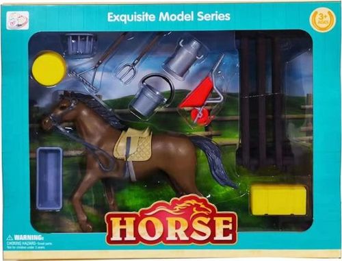 Konik, dodatkowe akcesoria: siano, miska do picia, taczka, wiadro, przeszkody do skakania, Produkt nie potrzebuje baterii. Zabawka przeznaczona dla dzieci powyżej 3 roku życia.