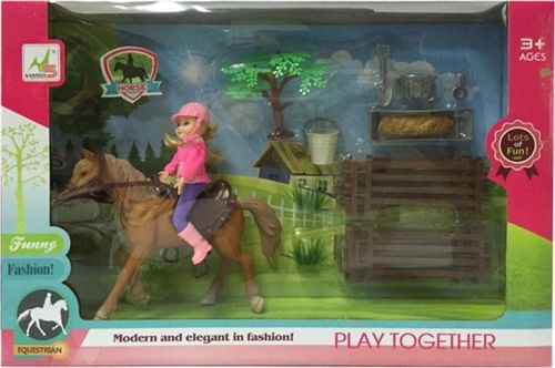 Zestaw zawierający stajnię, figurkę konia i jeźdźca wraz z akcesoriami.