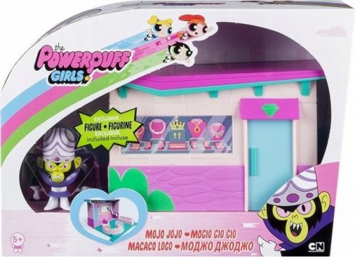 Zestaw akcji Sklep jubilerski + Mojo Jojo składa się z kolorowego sklepu z biżuterią, który można otworzyć. W środku znajduje się lustro, kasa oraz lady jubilerskie. Do zestawu dołączona jest również ekskluzywna figurka Mojo Jojo, genialnej małpy, podobnej do człowieka. Figurka jest wierną kopią bajkowej postaci. Ma na sobie biało-fioletowy hełm oraz fioletową pelerynę