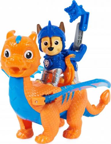 Spin Master Psi Patrol Odważni Rycerze Chase + smok Cechy produktu : wiek: 3+ zestaw zawiera: figurkę pieska + smoka wysokość figurki: ok. 6,5 cm wysokość smoka: ok. 11 cm materiał: plastik smok na grzbiecie posiada przycisk, dzięki któremu porusza skrzydłami Rocky jest mieszańcem i w serialu zajmuje się recyklingiem. Ubrany jest w zieloną zbroję rycerską i hełm.