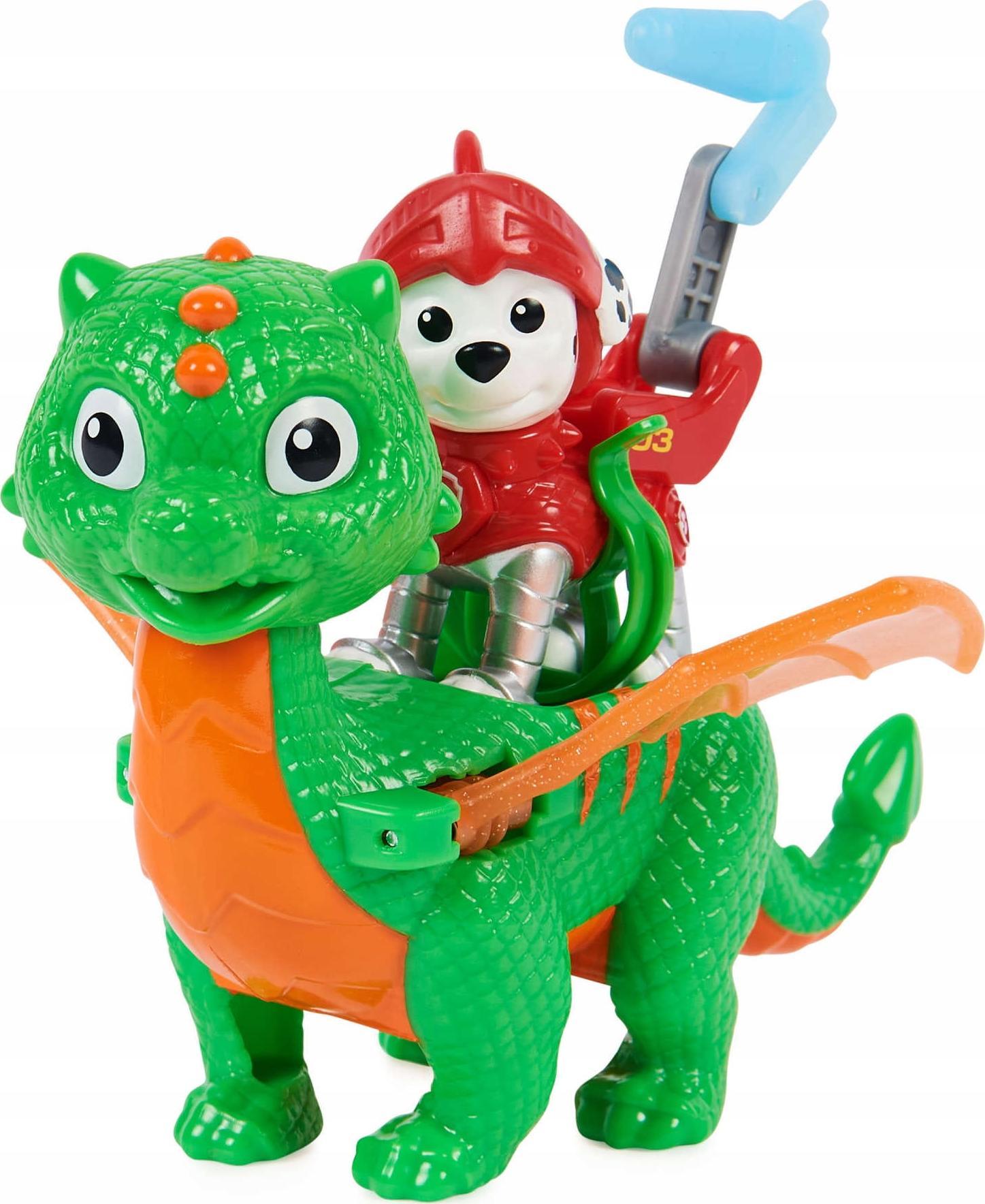 Spin Master Psi Patrol Odważni Rycerze Marshall + smok Cechy produktu : wiek: 3+ zestaw zawiera: figurkę pieska + smoka wysokość figurki: ok. 6,5 cm wysokość smoka: ok. 11 cm materiał: plastik smok na grzbiecie posiada przycisk, dzięki któremu porusza skrzydłami Rocky jest mieszańcem i w serialu zajmuje się recyklingiem. Ubrany jest w zieloną zbroję rycerską i hełm.