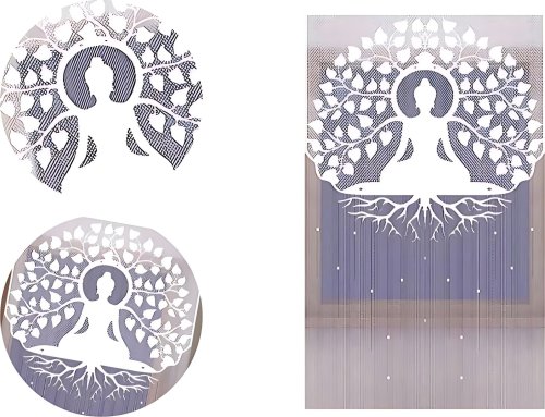 Sznurkowa dekoracja okienna upiększona jest symbolem świętego drzewa figowego, pod którym Budda medytował i osiągnął oświecenie.