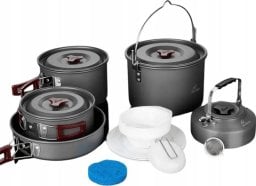 Zestaw waży jedynie 1522 g, co czyni go niezwykle lekkim i łatwym do transportu. Anodowane aluminium, z którego wykonane są garnki, patelnia i czajnik, gwarantuje trwałość oraz odporność na uszkodzenia, co sprawia, że zestaw jest idealny do użytku w trudnych warunkach outdoorowych.
