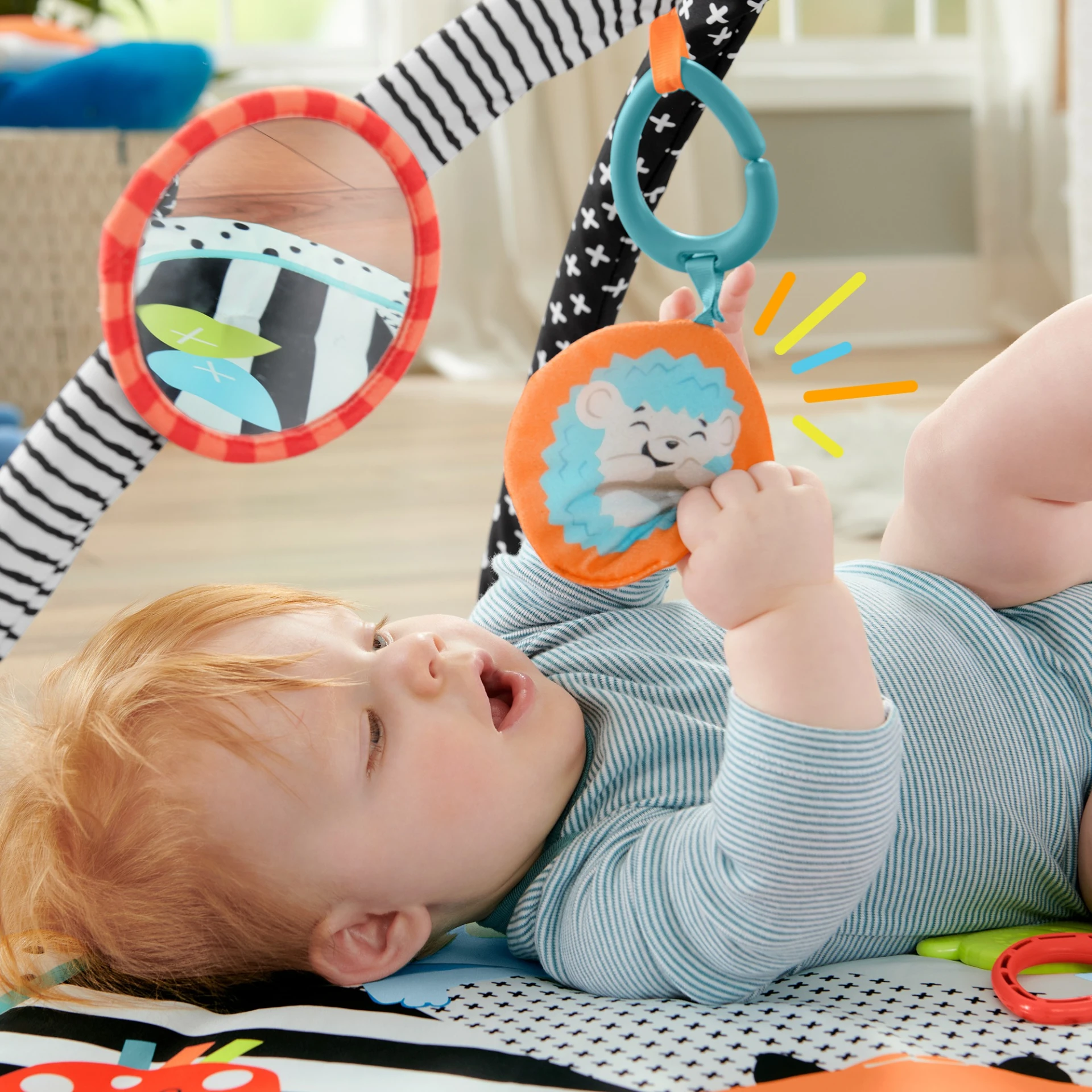 - Sprawność ruchowa: podnoszenie się, by skupić się na zabawkach, wzmacnia mięśnie szyi oraz tułowia maluszka.