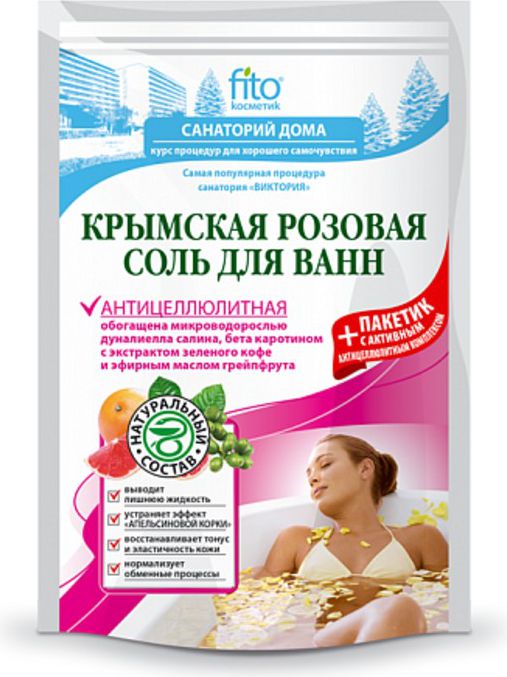 Krymska, różowa sól do kąpieli –„antycellulitowa” - to prawdziwa sesja SPA dla piękna i harmonii ciała. Olejek z grejpfruta w połączeniu z aktywnym kompleksem antycellulitowym na bazie zielonej kawy przyspiesza przemianę materii, usuwa toksyny i nadmiar płynów z organizmu.