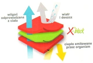X-Block Wind&Water Protection - nowoczesny materiał wykonany z dwóch warstw polaru oraz znajdującej się pomiędzy nimi membrany poliuretanowej. Gwarantuje pełną ochronę przed wiatrem i wyjątkowy komfort użytkowania, chroni przed lekkim deszczem. Ponadto, dzięki porowatej strukturze membrany para wodna (pot) swobodnie wydostaje się na zewnątrz materiału, skutecznie zapobiegając zbieraniu się nadmiaru wilgoci powstałej przy wzmożonym wysiłku.