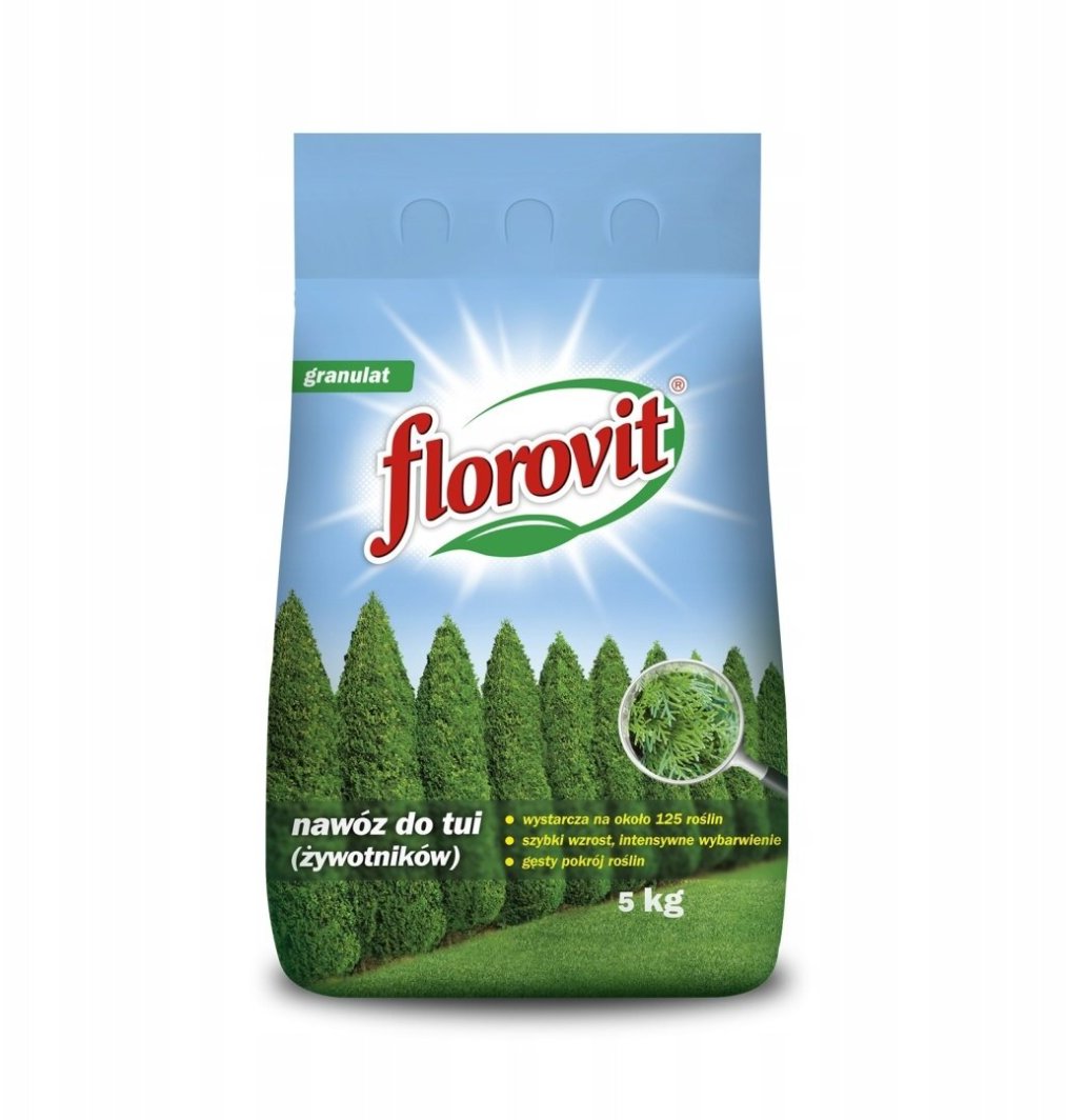 Nawóz Florovit zawiera NPK (MgO + SO3) w proporcjach 11,5 – 6,0 – 11,0, wzbogacony o żelazo, co czyni go idealnym wyborem dla tui. Jego skład to: