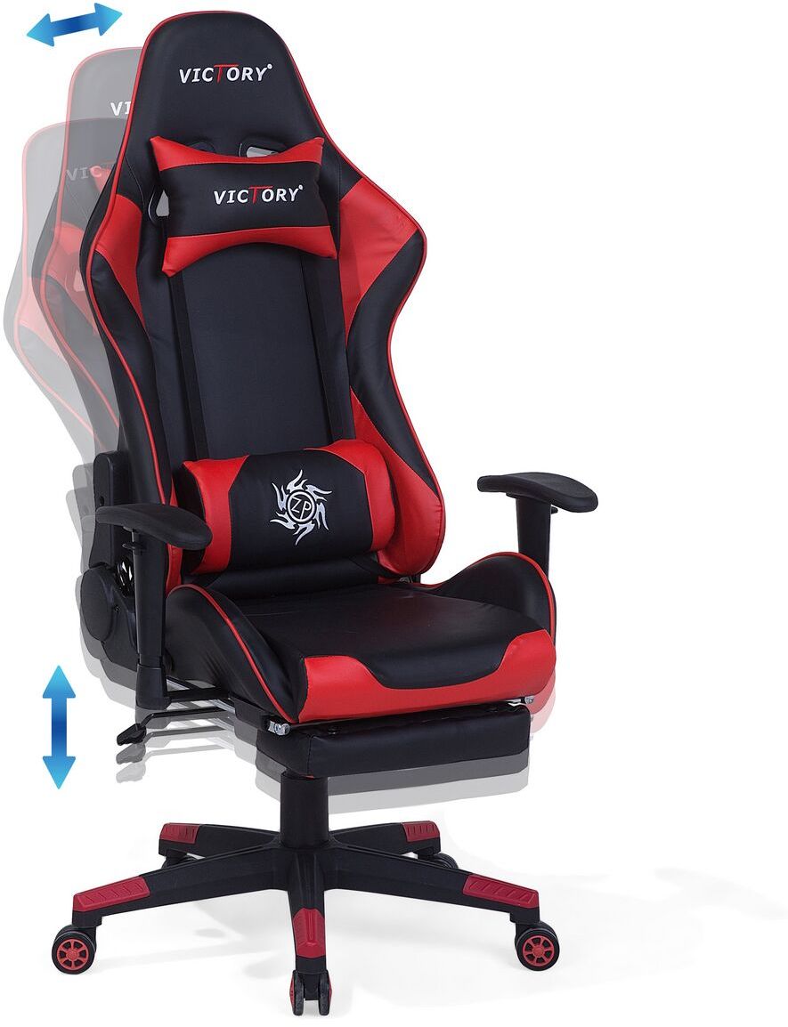 Praktyczny i ergonomiczny fotel gamingowy to podstawa przy długim korzystaniu z komputera. Regulowane krzesło biurowe VICTORY wykonane jest z przyjemnej w dotyku ekoskóry. Elegancki czarno-czerwony design zachwyca wygodą użytkowania. Poduszki umieszczone na elastycznych paskach na wysokości głowy i lędźwi pozwalają zmniejszyć zmęczenie tych partii ciała.