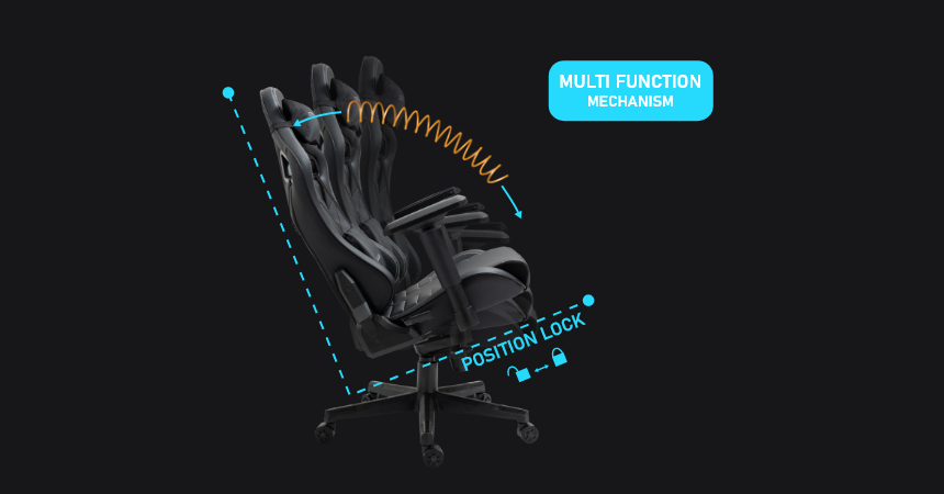 ![]() | MECHANIZM MULTI FUNCTION (aka FROG)W modelu G 808 możliwości w zakresie regulacji pozycji fotela idą o krok dalej. Zastosowany tutaj mechanizm MULTI FUNCTION (znany też jako FROG), rozszerza funkcjonalność tego fotela nie tylko o bujanie (odchylanie całego fotela do tyłu), ale dodatkowo pozwala na zablokowanie fotela w odchylonej pozycji, a więc pozwala na pełną kontrolę zarówno kąta odchylenia oparcia, jak też siedziska. Ustawienie fotela np. w pozycji charakterystycznej dla fotela samochodu wyścigowego – aby zwiększyć immersję w grze - nie jest zatem problemem. Dodatkowo mechanizm ten cechuje zmiana osi odchylenia siedziska na bardziej wygodne i naturalne (oś nie przebiega centralnie pod siedziskiem, tylko jest bliżej przedniej części siedziska). | ||||||||||||||||||||||||||||||||||||||