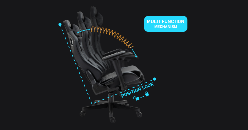 ![]() | MECHANIZM MULTI FUNCTION (aka FROG)W modelu G 808 możliwości w zakresie regulacji pozycji fotela idą o krok dalej. Zastosowany tutaj mechanizm MULTI FUNCTION (znany też jako FROG), rozszerza funkcjonalność tego fotela nie tylko o bujanie (odchylanie całego fotela do tyłu), ale dodatkowo pozwala na zablokowanie fotela w odchylonej pozycji, a więc pozwala na pełną kontrolę zarówno kąta odchylenia oparcia, jak też siedziska. Ustawienie fotela np. w pozycji charakterystycznej dla fotela samochodu wyścigowego – aby zwiększyć immersję w grze - nie jest zatem problemem. Dodatkowo mechanizm ten cechuje zmiana osi odchylenia siedziska na bardziej wygodne i naturalne (oś nie przebiega centralnie pod siedziskiem, tylko jest bliżej przedniej części siedziska). | ||||||||||||||||||||||||||||||||||||||