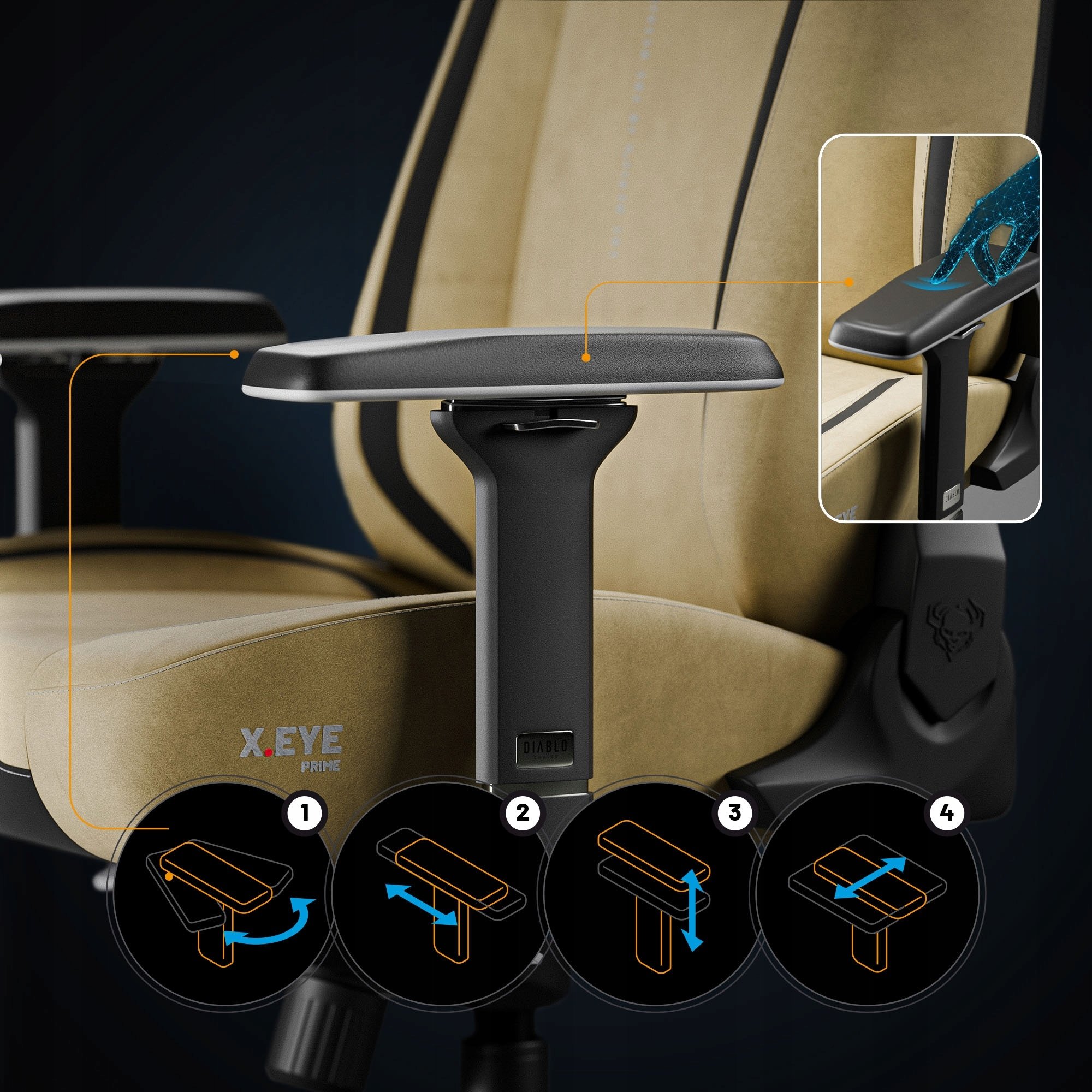 Diablo X.Eye Prime nie pomija oczywiście łokci i przedramion. Podłokietniki Armtech™ Quatro Premium oferują aż 4 kierunki modyfikacji (góra-dół, przód-tył, lewo-prawo, skosy) i możliwość blokady pozycji. Barki i przedramiona zyskują solidną stabilizację, a miękkie wykończenie podłokietników niesie ulgę łokciom.