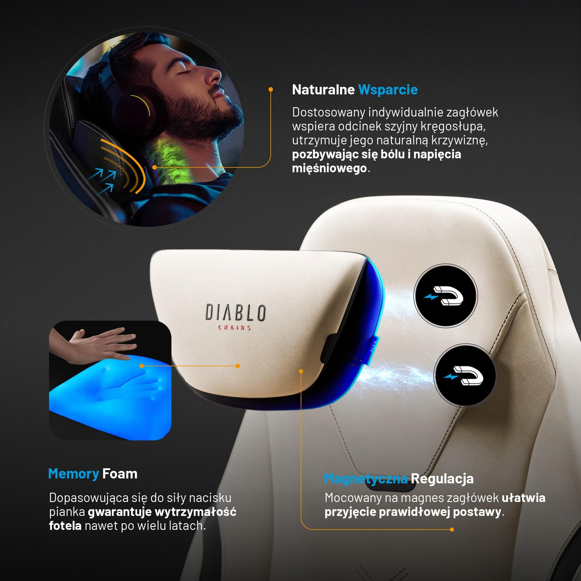 Jedną z najczęstszych dolegliwości wśród graczy jest ból i napięcie w okolicy karku. Ale nie z fotelem Diablo X.Eye Prime! Specjalny magnetyczny zagłówek perfekcyjnie stabilizuje odcinek szyjny kręgosłupa i sprzyja przyjęciu ergonomicznej postawy. Mocowanie zagłówka na magnes to strzał w dziesiątkę – nic nie przesuwa się bez Twojej zgody i nie przeszkadza w działaniu. Znajdująca się w środku pianka Memory wzorowo dopasowuje się do Twojej sylwetki.