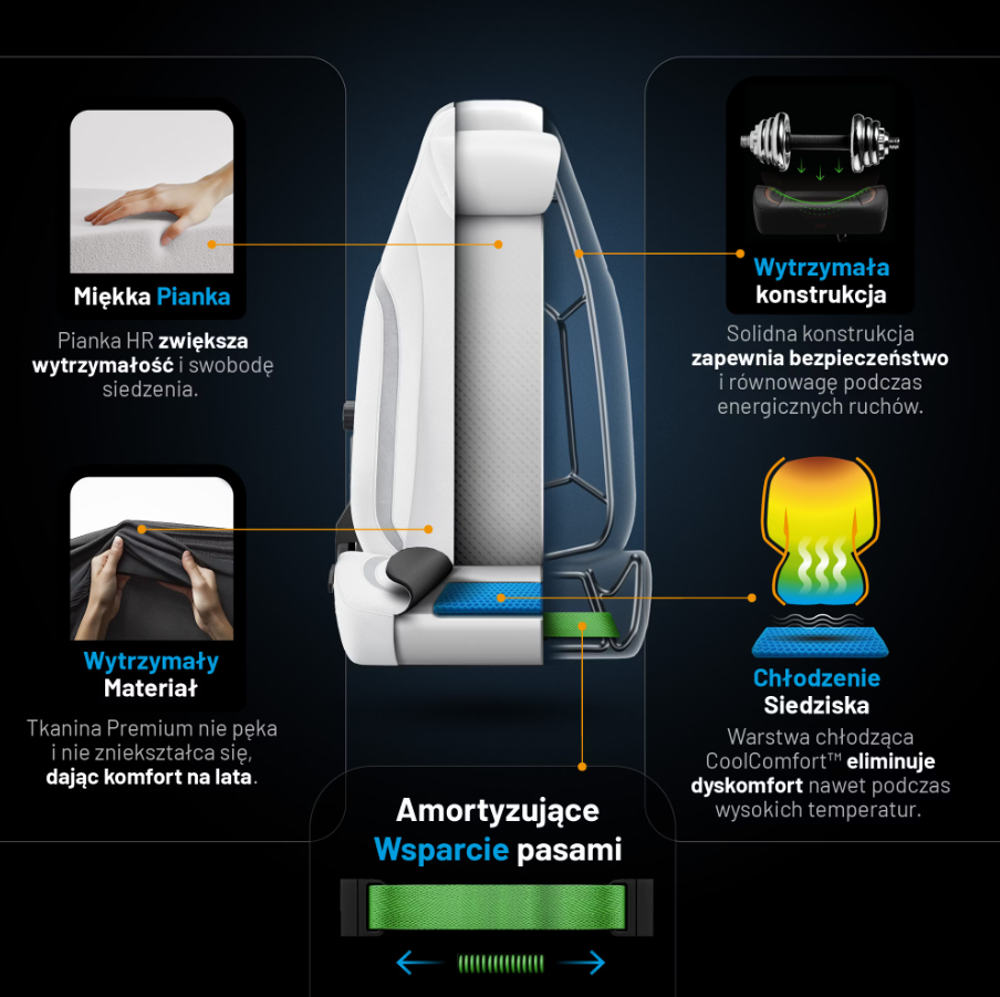Starannie dopracowana technologia CoolComfort™ gwarantuje orzeźwiający komfort już od pierwszych chwil spędzonych w fotelu. Siedzisko zapewnia niezakłócony przepływ powietrza i wyjątkową świeżość nawet przy wysokich temperaturach. W fotelu X.Eye Prime przetrwasz każde warunki!